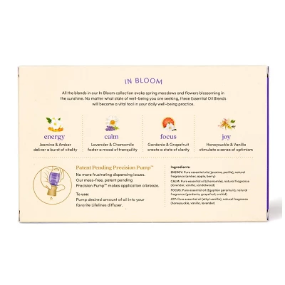 All the blends in our In Bloom collection evoke spring gardens and flowers blossoming in the sunshine. Hints of lavender, jasmine, gardenia, and honeysuckle create an extraordinary aroma experience across four unique blends. Add the perfect amount of oil to your favorite Lifelines diffuser with no guesswork and no spills using our patent pending Precision Pumpā¢.
