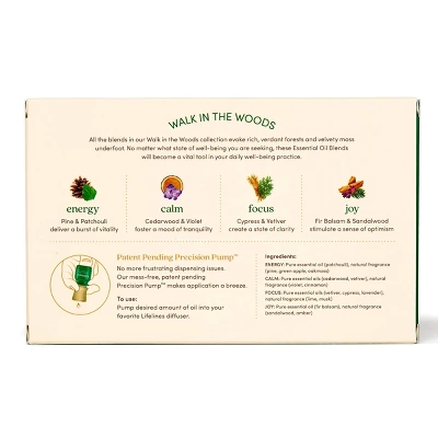 All the blends in our Walk in the Woods collection evoke rich, verdant forests and velvety moss underfoot. Hints of cypress, pine, sandalwood, and patchouli create an extraordinary aroma experience across four unique blends. Add the perfect amount of oil to your favorite Lifelines diffuser with no guesswork and no spills using our patent pending Precision Pumpā¢.