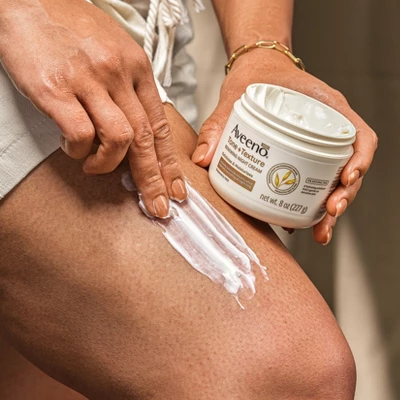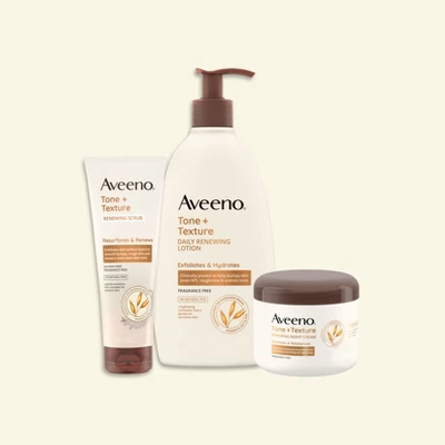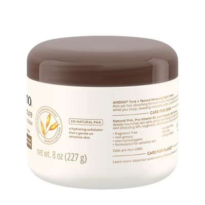 Instantly soften and smooth skin while nourishing all night long with Aveeno Tone + Texture Renewing Night Cream with prebiotic oat. Designed to gently exfoliate and moisturize sensitive skin as you sleep, the nourishing renewing cream from a dermatologist-recommended brand hydrates sensitive skin while gently resurfacing to visibly improve bumpy skin (including KP), roughness, discoloration, and uneven skin tone. In fact, with just one use, skin is noticeably softer and smoother. The exfoliating cream is formulated with 6% natural PHA, Pro-Vitamin B3, and prebiotic oat, and has a non-greasy, non-comedogenic, and fast-absorbing formula. A great addition to your nightly skin care routine, the exfoliating cream evens skin tone, is fragrance-, paraben-, and dye-free. Apply the night body cream as desired to clean skin to nourish skin while gently exfoliating while you sleep.