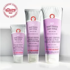 First Aid Beauty’s KP Bump Eraser Body Scrub with 10% AHA sweeps away dry, rough bumps associated with KP & strawberry skin, to reveal healthier skin.