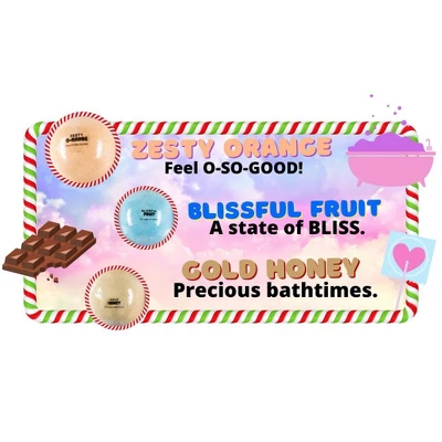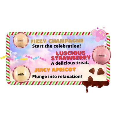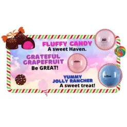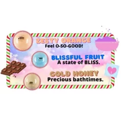 - • Juicy Apricot – Plunge into relaxation! • Fluffy Candy – A sweet haven! • Fizzy Champaign – Start the celebration! • Blissful Fruit – A state of bliss! • Grateful Grapefruit – Be great! • Gold Honey – Precious bathtimes! • Yummy Jolly Rancher – A sweet treat! • Luscious Strawberry – A delicious treat! • Zesty O-range – Feel O-So-Good!