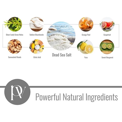 - Powerful natural ingredients; Sheer leafy green notes, sodium bicarbonate, dead sea salt, orange peel, grapefruit, sunwashed woods, citric acid, yuzu, sweet bergamot.