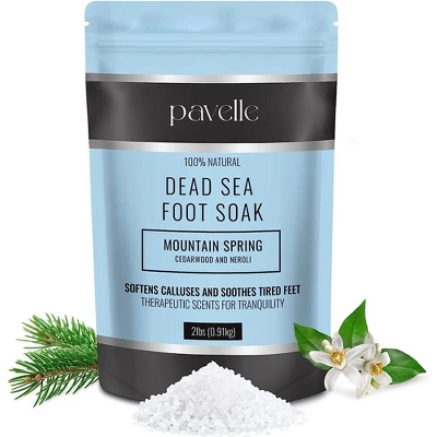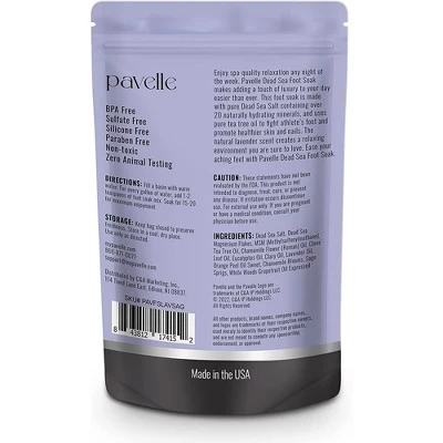 Give your feet the pampering they needEnjoy spa-like relaxation in the comfort of your home with the Pavelle dead sea foot soak. Add this scented foot soak into a container of warm water and let your stress and pain wash away as soon as you step in. Soak your feet in a perfectly uniform mixture of essential oils and natural ingredients. This quality blend of sea salt and minerals adds a touch of luxury and relief to self-care activities.Rest easy knowing this 100% natural, therapeutic formula cleans and heals the skin. A nice, calming dip in this mixture helps to soften calluses, relieve athlete’s foot, eliminate foot odor, and so much more. Your feet are one of the hardest working parts of your body so pamper them with the Pavelle dead sea foot soak. Show your feet you care by treating them to absolute bliss with a safe, cruelty-free stress reliever. Have peace of mind knowing you are soaking your feet in a non-animal tested remedy that doesn’t contain harmful ingredients, parabens, or artificial fragrances.