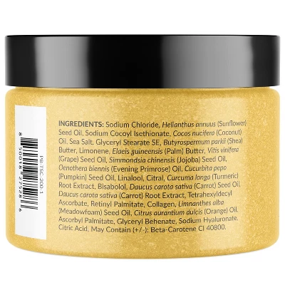 The luxurious Pure Biology Turmeric Exfoliating Body Scrub is a gentle yet effective exfoliating scrub body polish that features premium natural ingredients that soothe irritated skin and promote even, glowing skin.* Turmeric makes this body exfoliator scrub the best body scrub available to help renew and brighten uneven skin tone.* Our 4-in-1 natural body scrub cellulite remover stretch mark remover bump eraser body scrub and dead skin remover for body can also be used as a clarifying acne scrub exfoliating face scrub and exfoliating foot scrub thanks to its dynamic refreshing skin exfoliator properties.* This turmeric body scrub exfoliator for women is loaded with proven antioxidants that inspire healthier glowing skin.* A gentle body exfoliant featuring collagen and retinol to help reduce cellulite and stretch marks.* Polish and detox your pores with our sea salt body exfoliator scrub to calm irritation and promote its natural glow.* Our blend of Shea Butter and Coconut Oil help reduce the appearance of face and back acne, cellulite and stretch marks, wrinkles and fine lines, dark spots, uneven bumps and more! Enjoy this skin softening exfoliating body scrub for yourself or give the tumeric scrub as a holiday gift – suitable for women and men of all skin types!* Pure Biology offers two unique body scrubs for women and men for total body detox relaxation.* Our turmeric body scrub with sea salt detoxifies and brightens uneven skin tone, while our Probiotic Sugar Scrub helps lock in moisture and maintain balanced skin tone.* Transform your bathroom into a spa with our romantic body scrubs today.*